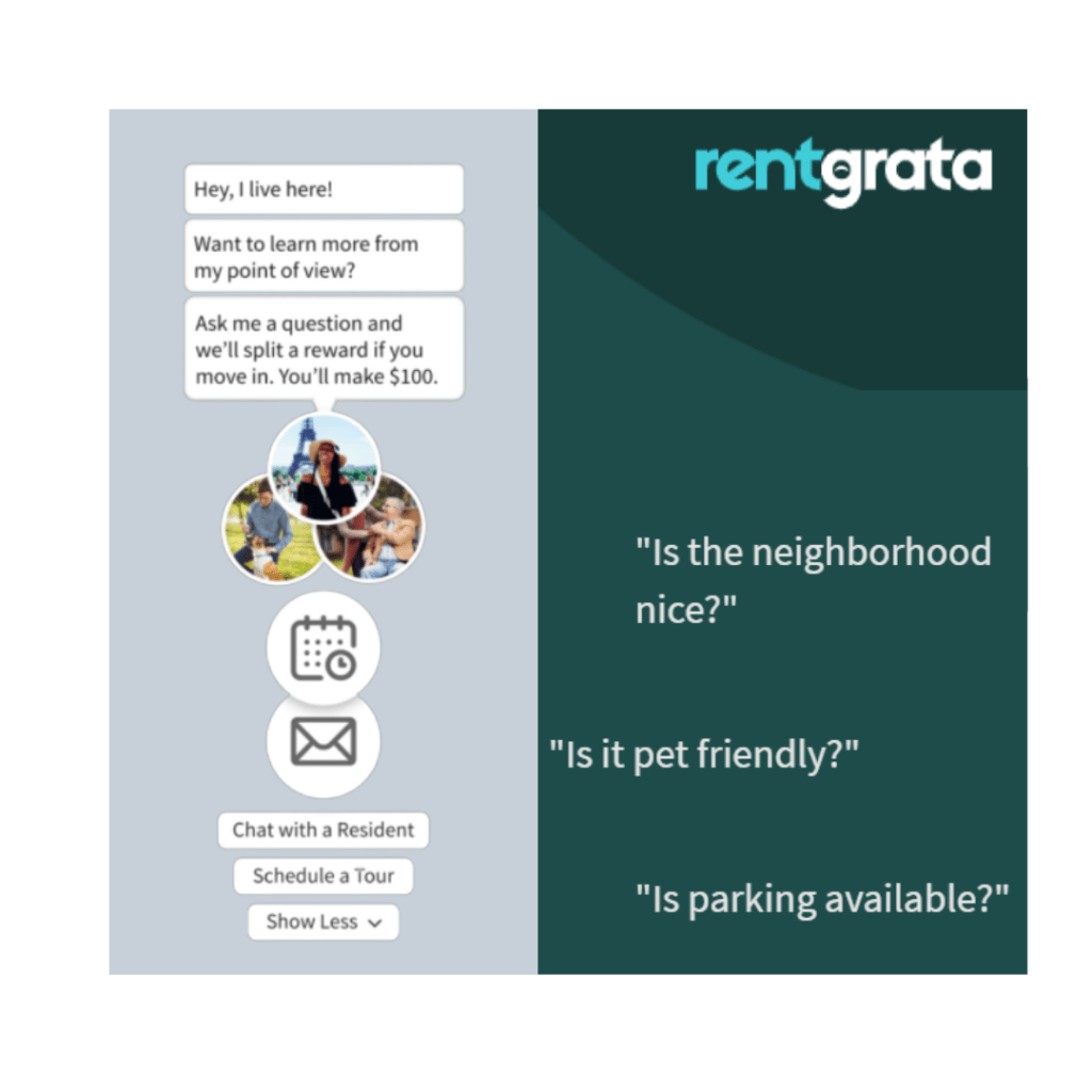 This advertisement was used on social media to promote the product Rentgrata. Rentgrata partnered with the property as an incentive for current residents to engage with prospective residents, and in return, both parties would receive an incentive.