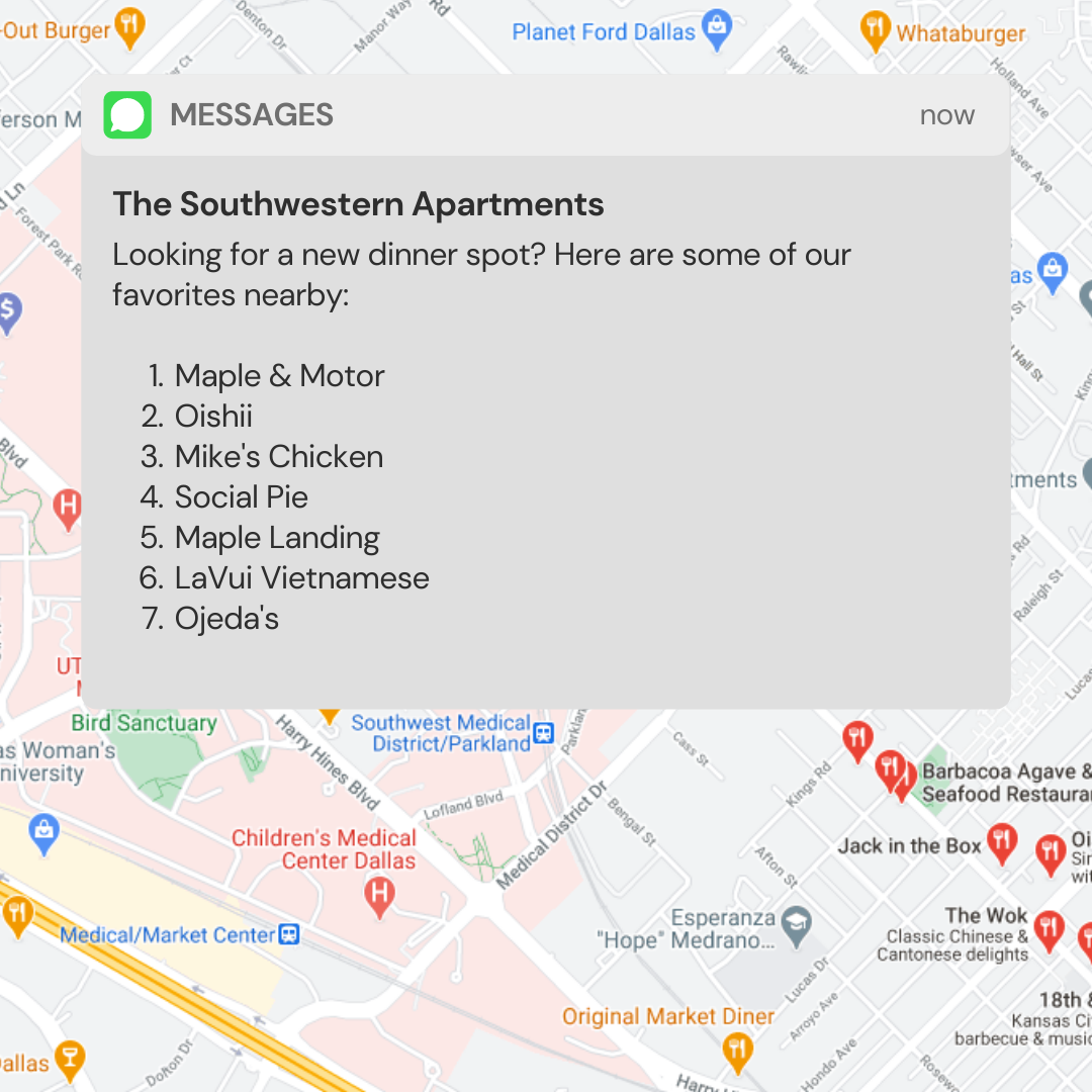 This post was created to engage resident’s and sell prospective resident’s on the property’s location by promoting local restaurants that are in close proximity.